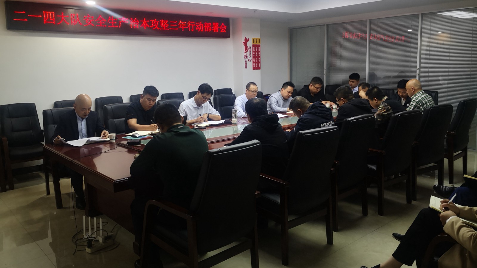 4月19日,二一四大隊在九鼎辦公樓四樓會議室召開2024年安全生產治本攻堅三年行動部署會。會議由公司黨委書記、董事長鄧盛波主持,公司安委會成員、各單位主管安全負責人等20余人參會。