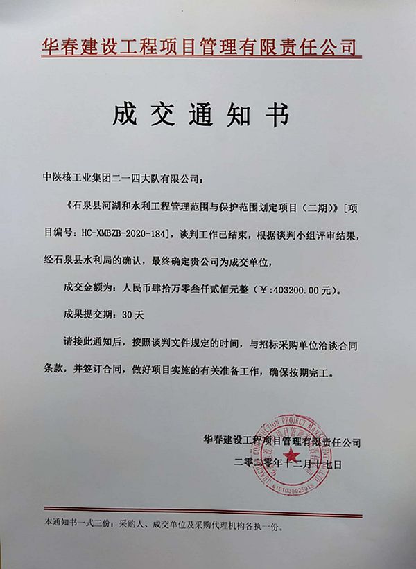 12月18日,從招標公司獲悉,公司成功中標《石泉縣河湖和水利工程管理范圍保護范圍劃定》項目。